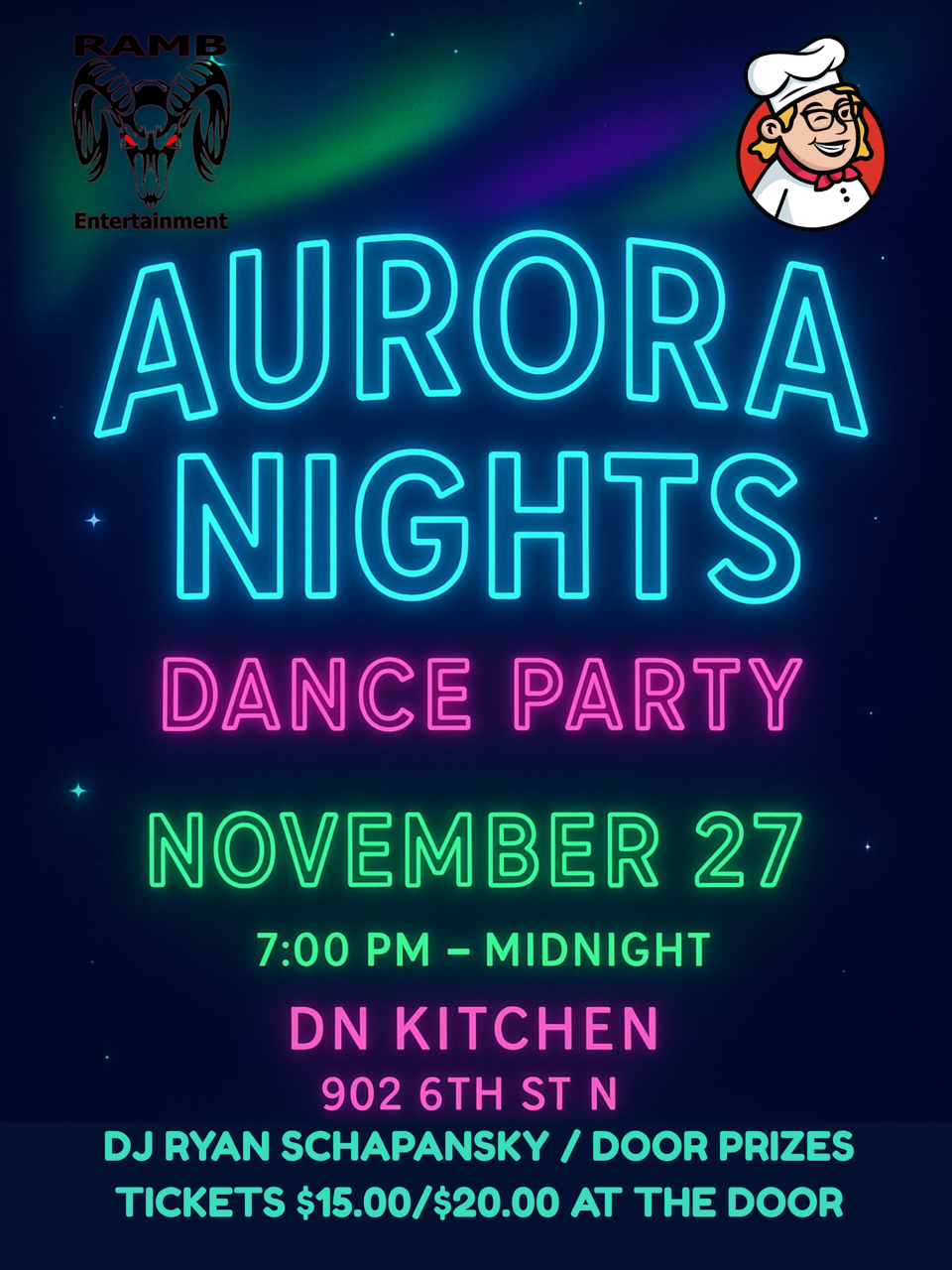 Get ready for a vibrant night of neon lights, music, and high-energy dancing at Aurora Nights. Join us for a glowing evening with DJ Ryan Schapansky, great company, and exciting door prizes.